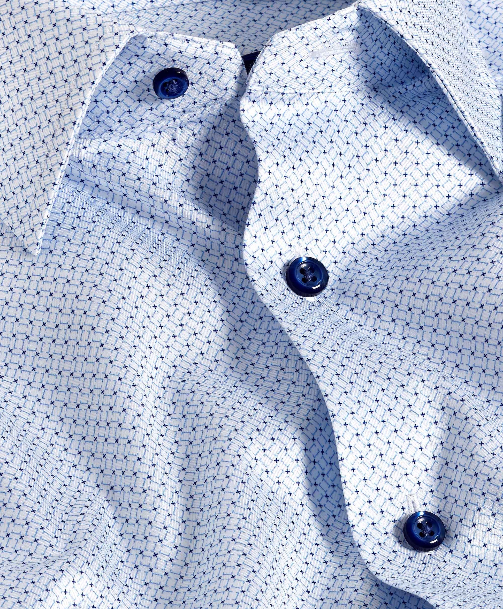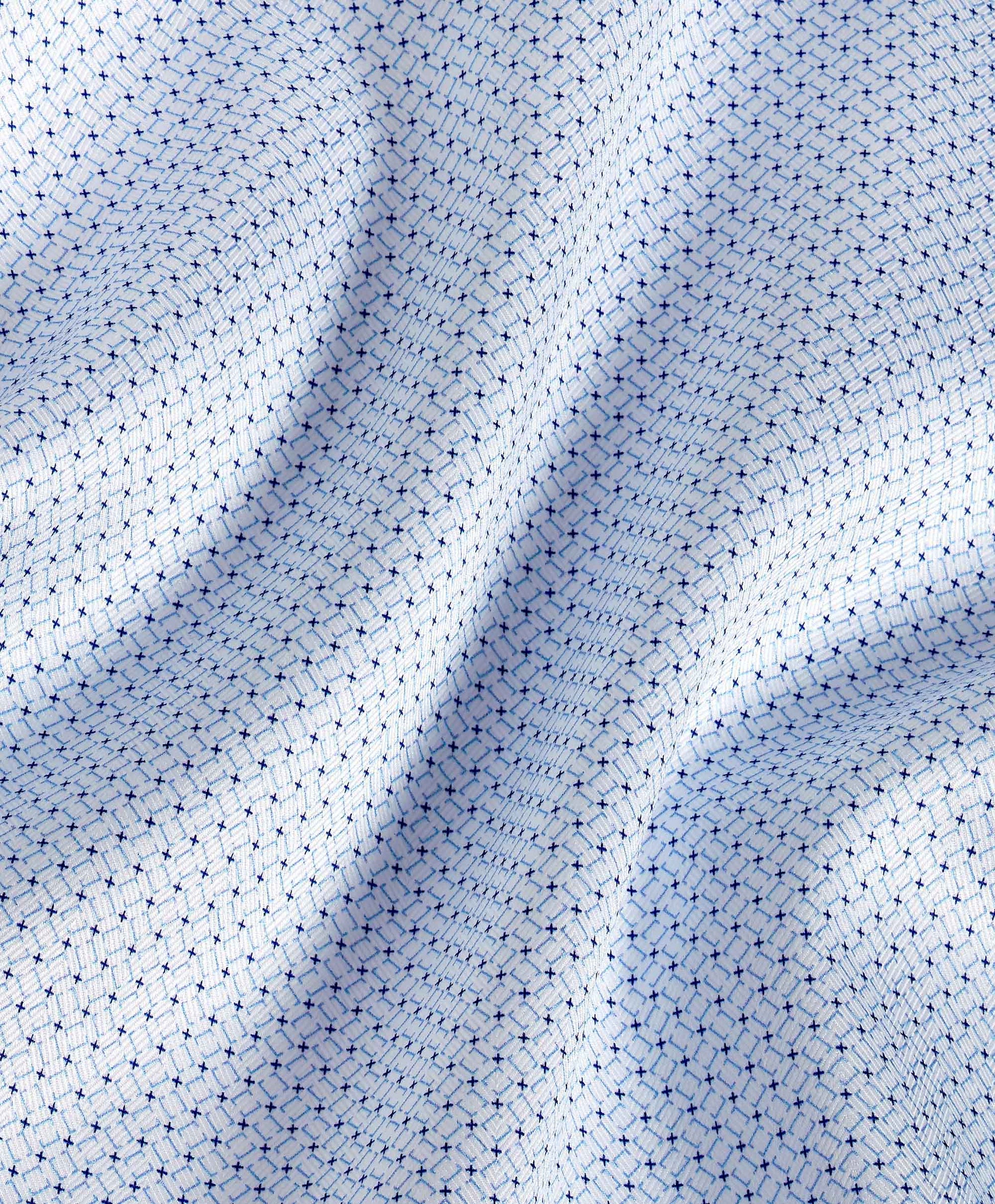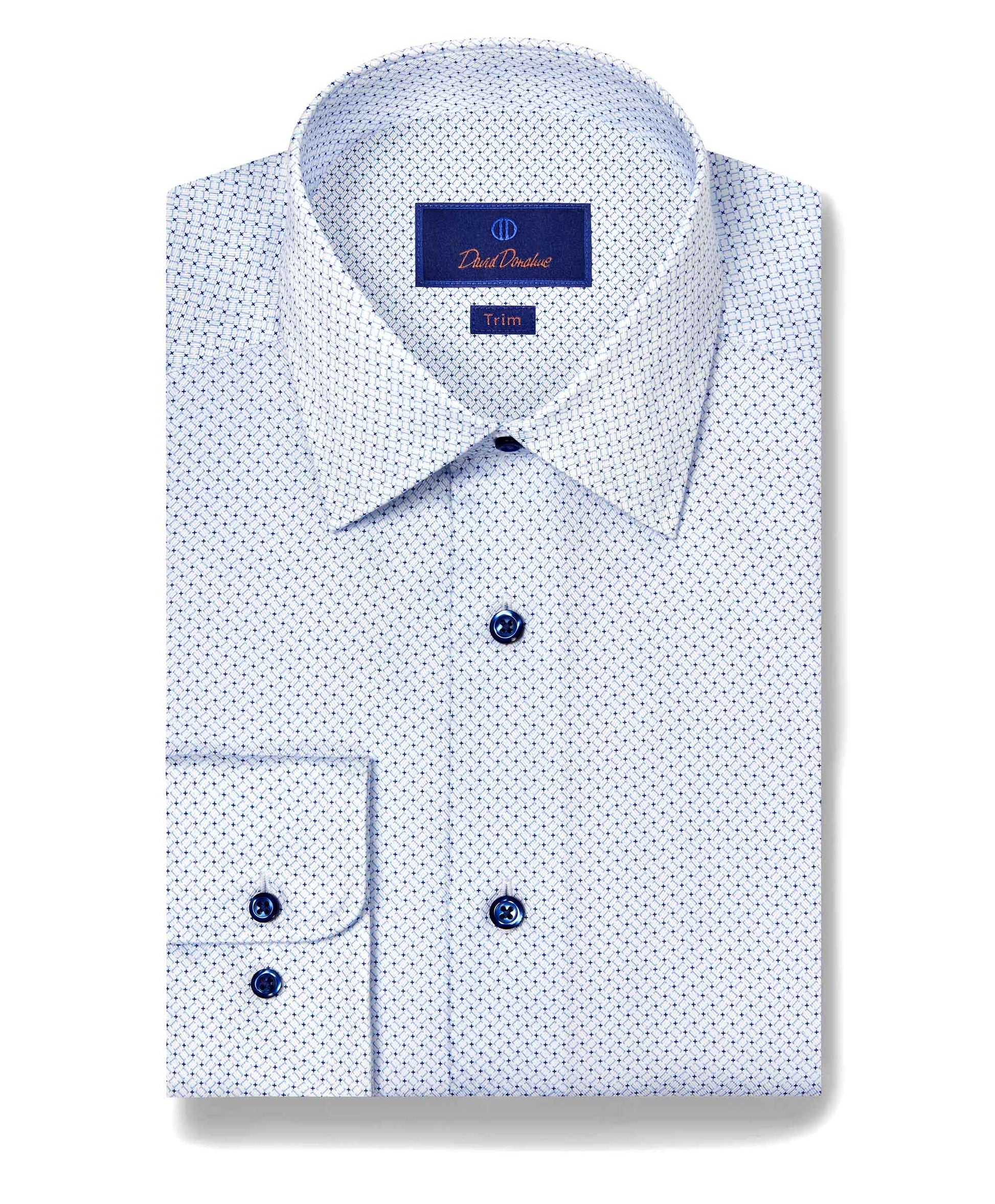 Make a refined statement with the David Donahue White & Blue Geometric Print Dress Shirt, crafted from 100% U.S. Pima Cotton in a 100/2 ply herringbone weave. The premium fabric offers a smooth handfeel, durability, and a subtle sheen, while the geometric print adds modern sophistication to a classic silhouette.
