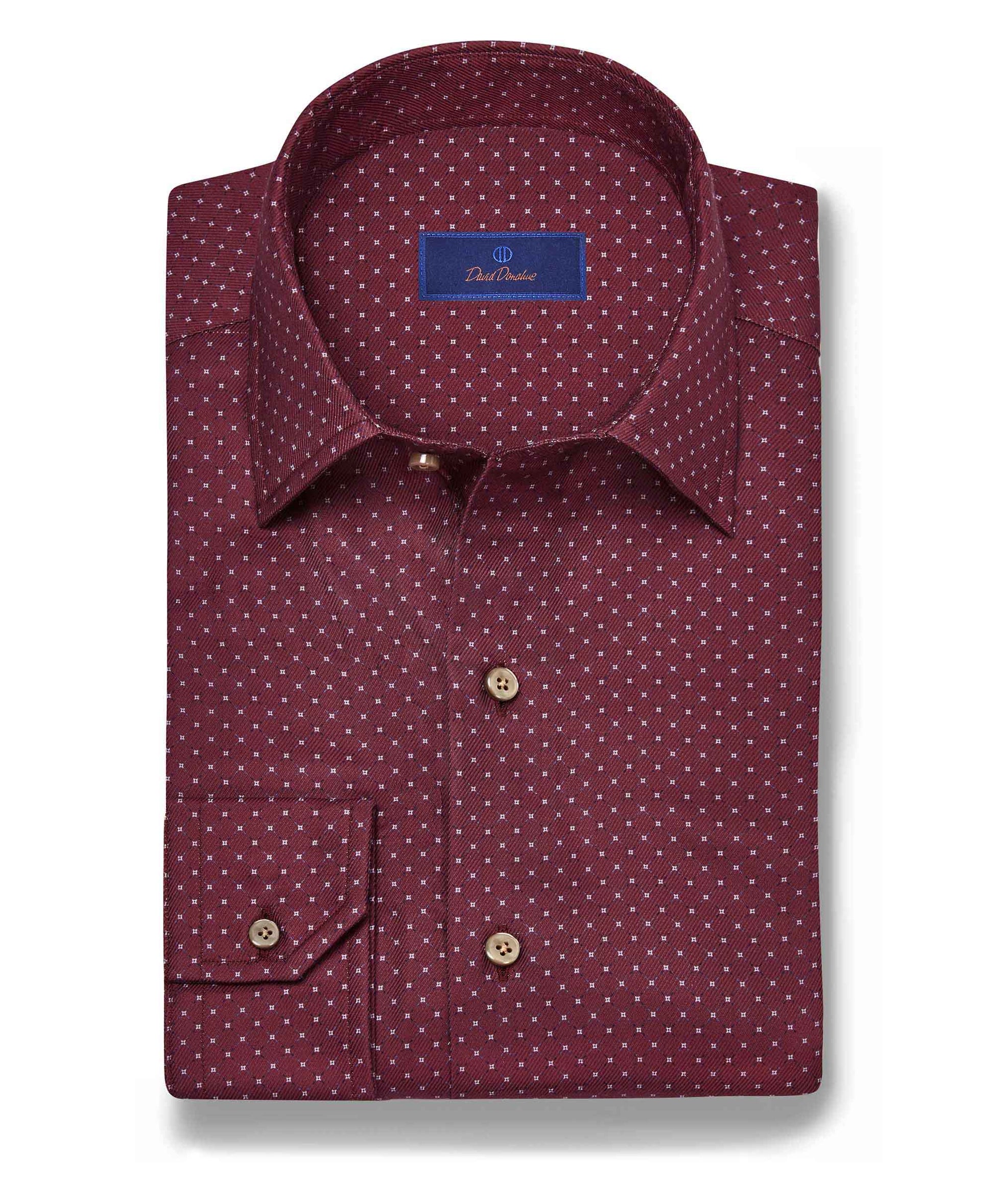 Sophisticated yet versatile, this David Donahue sport shirt is crafted from 100% US Pima Cotton in a 100/2 ply, 4/4 twill weave for exceptional softness and durability. The rich merlot micro print offers a modern update to a classic look, while the soft spread collar and trim details make it ideal for both professional and social occasions. Designed with two back pleats, it ensures comfort and ease of movement without sacrificing style.