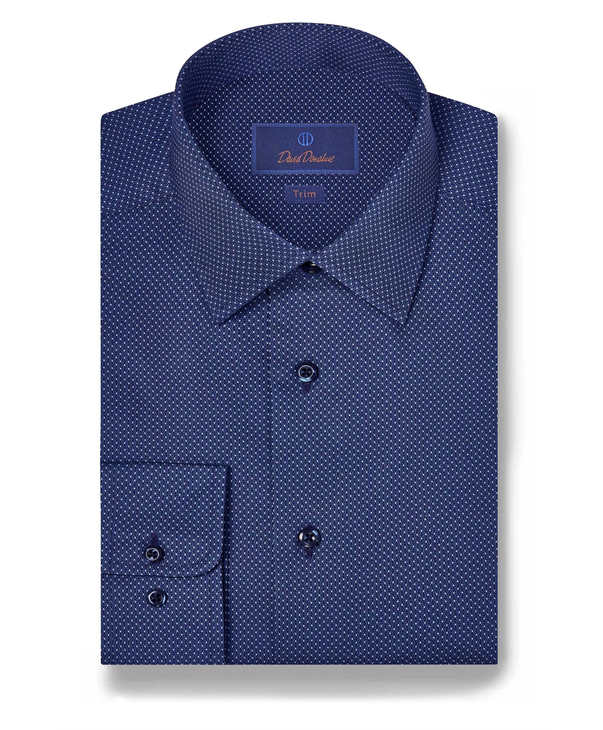 Effortlessly stylish, the David Donahue Navy Dot Print Sport Shirt is crafted from 100% U.S. Pima Cotton in a 100/2 ply, 4/4 twill weave for exceptional softness, durability, and a refined drape. The subtle dot print adds modern texture to a timeless silhouette, making it versatile for both casual and polished occasions.
