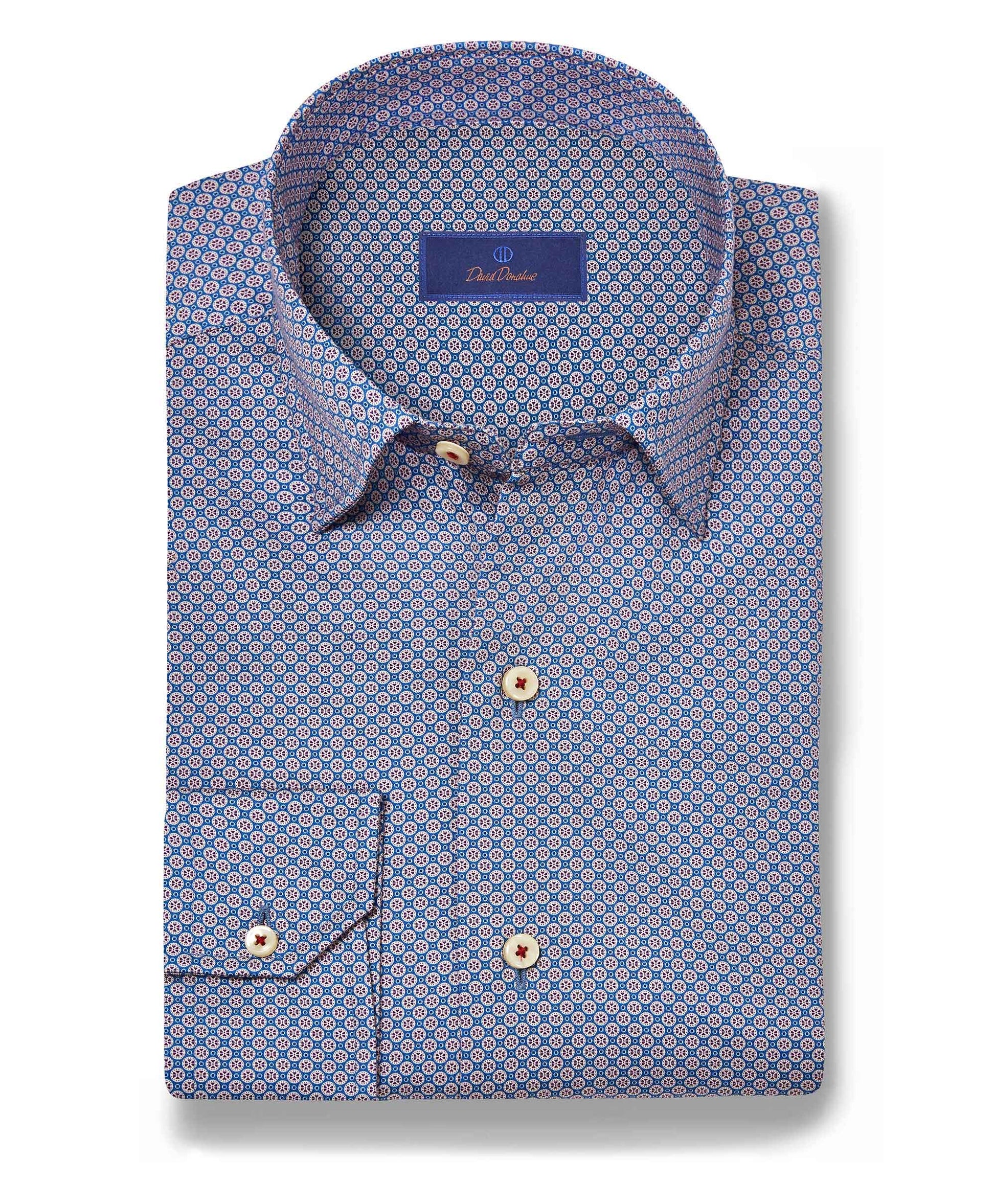 Elevate your wardrobe with this David Donahue sport shirt, tailored in a trim fit for a sleek, modern silhouette. Crafted from 100% US Pima Cotton in an 80/2 ply, 2/1 twill weave, it offers a soft hand feel with lasting durability. The blue geometric print adds subtle visual interest, while the soft hidden button collar keeps the look crisp and versatile. Designed with two back pleats, it ensures all-day comfort whether worn under a jacket or on its own.