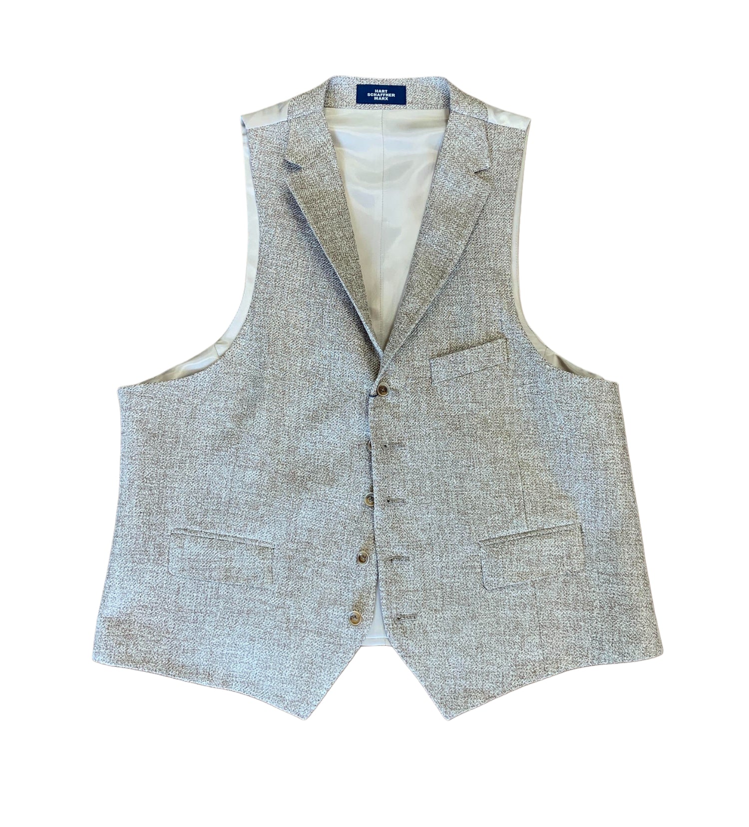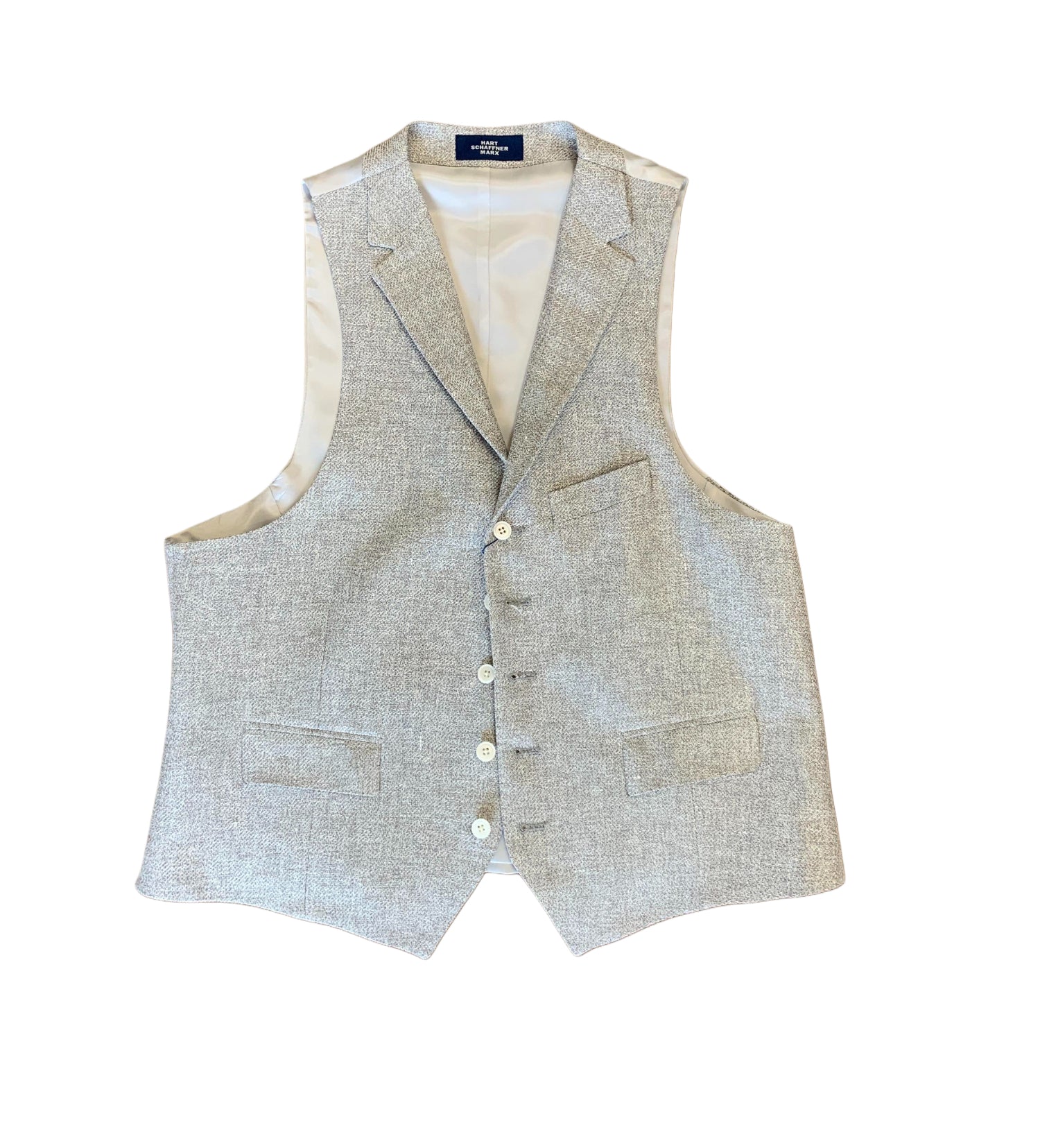 Gorgeous 5-button linen, silk blend vest with notch lapel and watch pockets from Hart Schaffner Marx. Available in three colors.