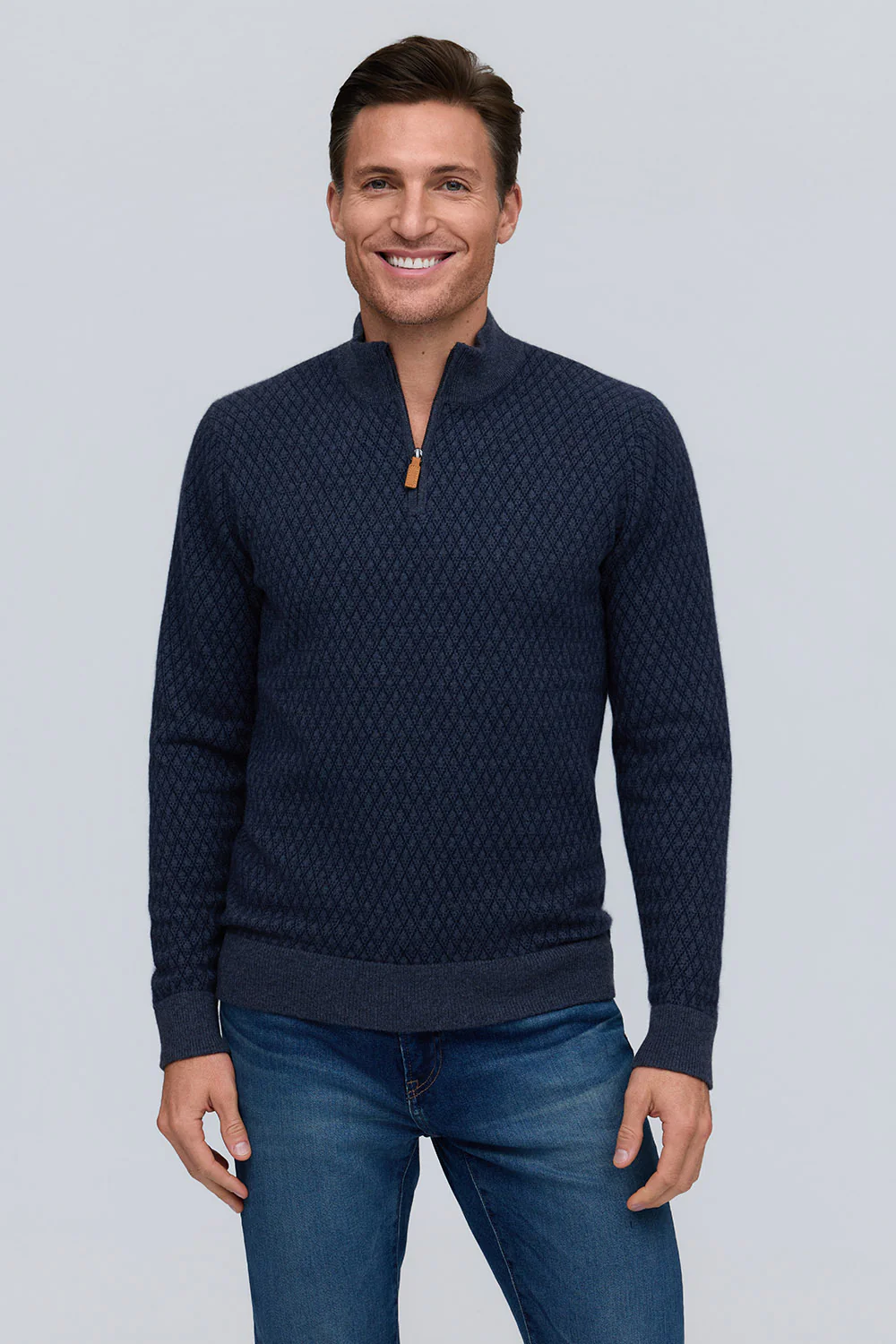Exquisitely crafted from 100% pure cashmere, this Raffi quarter zip sweater features a sophisticated jacquard diamond pattern enhanced by contrasting trims. The sleek zip mock neck adds a refined, contemporary edge to this timeless piece.