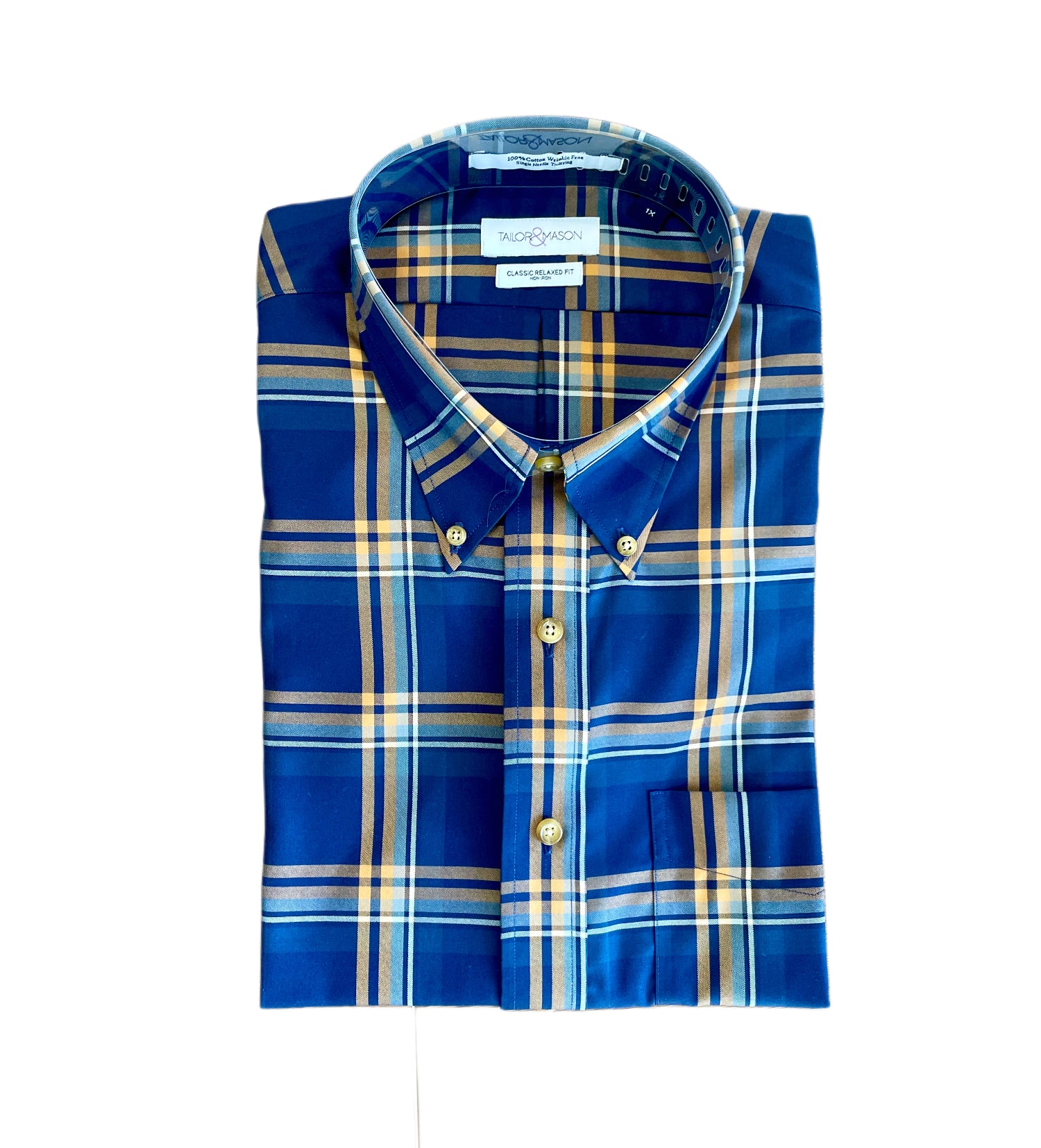 Crafted from 2-ply, wrinkle-free 100% cotton, this Tailor & Mason Big & Tall sport shirt combines vibrant style with everyday ease. The bold blue and orange plaid pattern adds a modern pop of color, while the premium cotton construction ensures comfort and breathability. Designed for a polished look straight out of the dryer, it’s the perfect choice for both work and weekend wear.